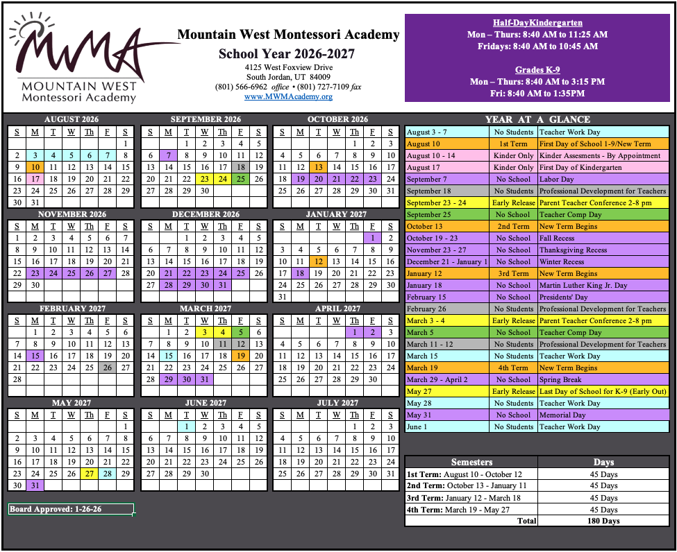 Mountain West Montessori Academy (MWMA) will follow a traditional school year calendar similar to the surrounding school districts calendar.