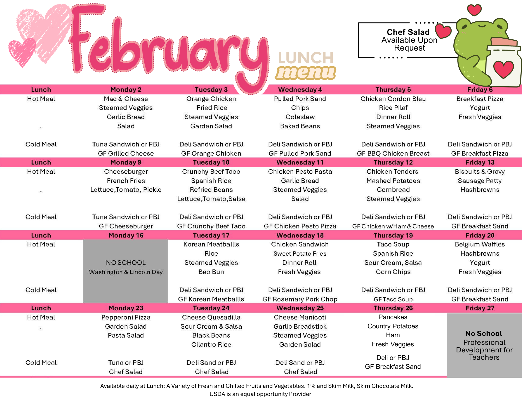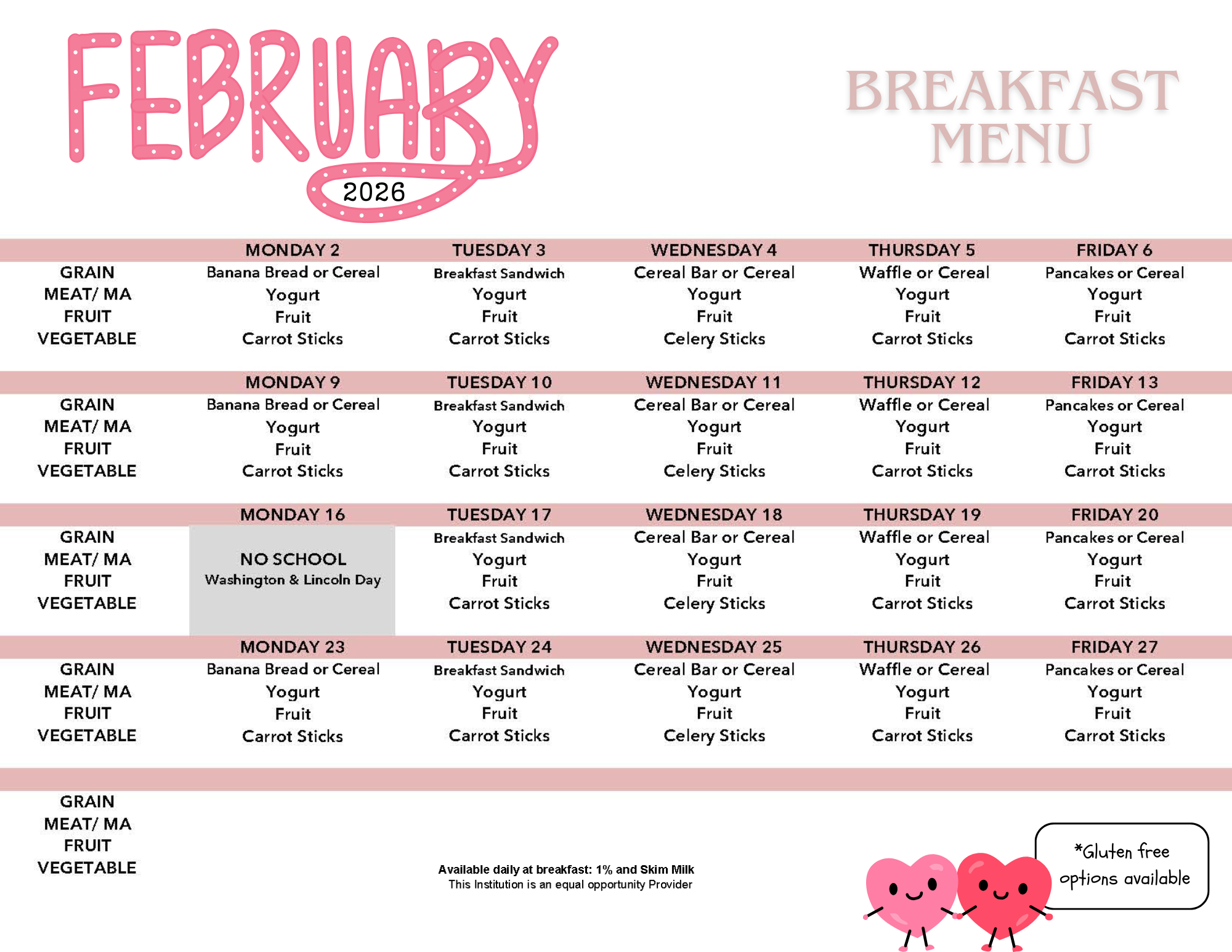 Lunch is now being served in our cafeteria. Children have the option of Hot Lunch, Sandwich/Wrap or a Salad. Daily cost of lunch is $3.00 per student and $5.00 for adults. Breakfast is $2.00 per student. We are currently working with the state to provide free/reduced lunch for those who qualify. Applications for free/reduced lunch for students can be found on your child's Aspire account.