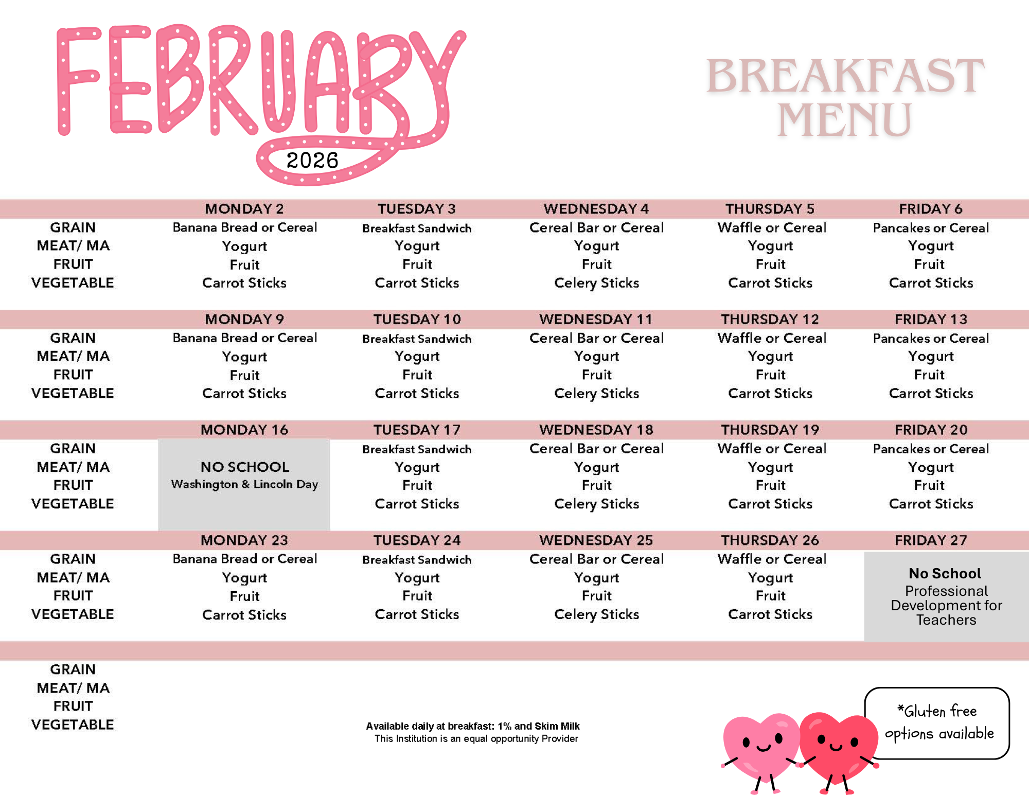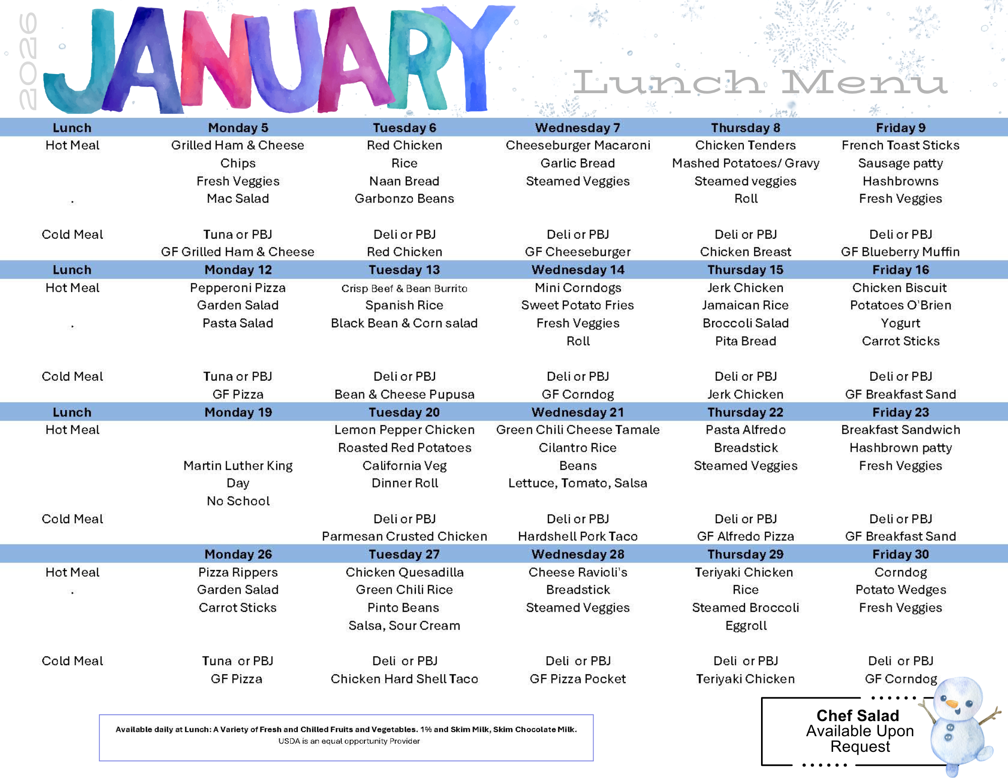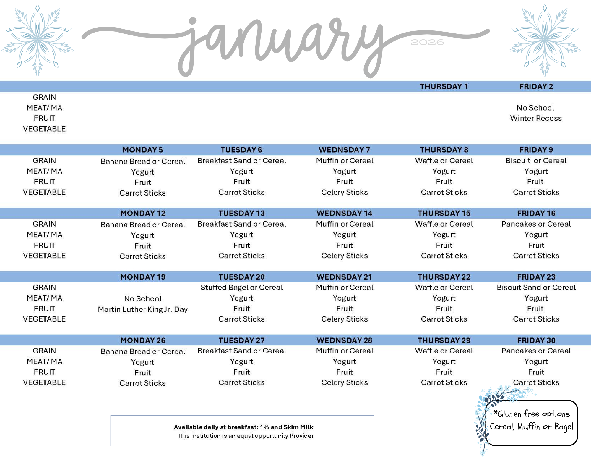 Lunch is now being served in our cafeteria. Children have the option of Hot Lunch, Sandwich/Wrap or a Salad. Daily cost of lunch is $3.00 per student and $5.00 for adults. Breakfast is $2.00 per student. We are currently working with the state to provide free/reduced lunch for those who qualify. Applications for free/reduced lunch for students can be found on your child's Aspire account.